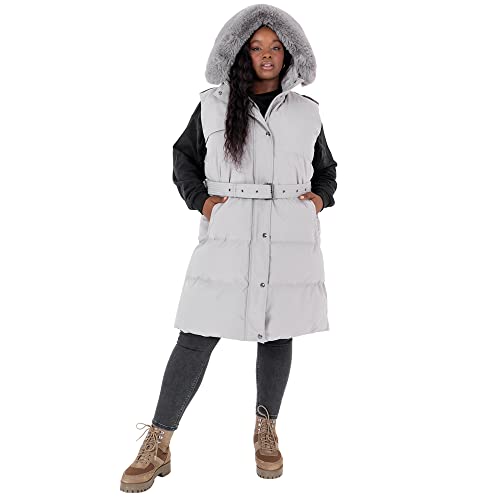 Lovedrobe Dam dam gilet ärmlös vinterjacka rock kropp varm plus storlek med bälte fickor fuskpäls huva krage kostym väst, SILVER, 56