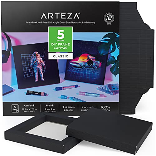 Arteza Gör-det-själv-ramdukar för målning, 5 ark, 23 x 23 cm – vikt, 100% bomull, 236 ml grundad fyrkantig svart duk, konsttillbehör för akryl, olja, temperament och gouache-målning