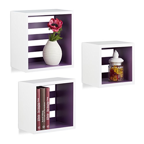 Relaxdays hängande hylla kub, vägghylla 3-pack, fyrkantig hylla för vägg, svävande hyllor, MDF, vit/violett