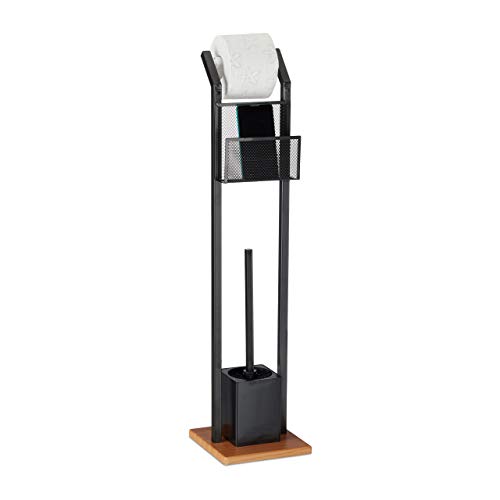 Relaxdays, svart set med hylla, pappershållare, toalettborste, borsthållare, fyrkantig fot, träutseende, höjd 78 cm, toalettuppsättning