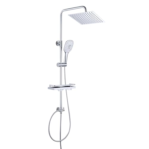 JOHO Regndusch i rostfritt stål, duschsystem, duschset, duschstång med hylla (huvuddusch 25 x 25 cm) fyrkantig krom