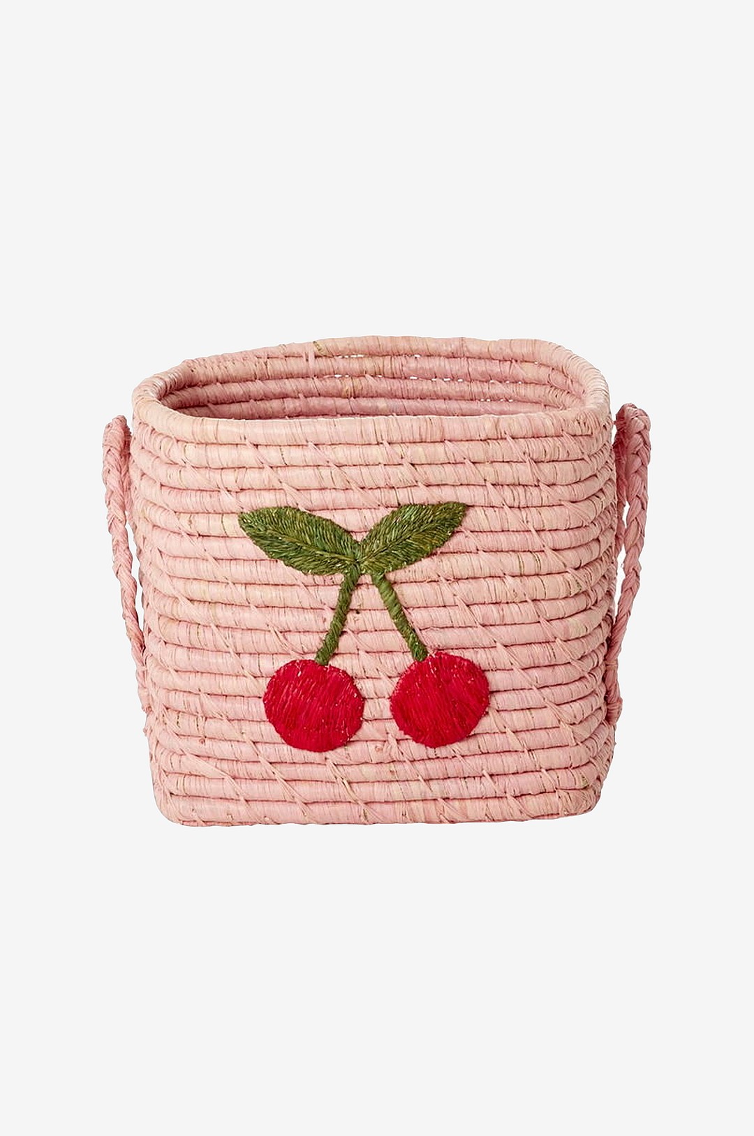 RICE - Raffia fyrkantig korg med stort körsbärsbroderi - Raffiahandtag - Liten - Rosa