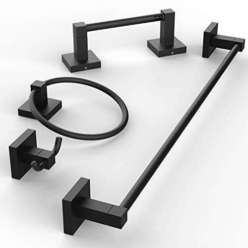 Ruacq Set med 4 delar badrumstillbehör, matt svart fyrkantig rostfritt stål och zinklegering, modern väggmontering, 45 cm handduksstång, toalettpappershållare, ring