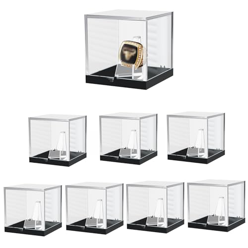8 stycken Championship ring monter med 8 stycken ringställ i akryl liten fyrkantig låda för mästerskapsringar transparent displaybox för sportfans 55 x 55 x 55 mm