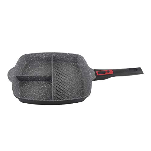 Rund stekpanna med fyrkantig grill med marmoreffekt - stekpanna och stekpanna, perfekt för kött och fisk, i aluminium, 24 cm stekpanna och stekpanna, 28 x 28 cm