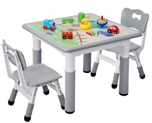 Barnbord med 2 stolar, barnstolsgrupp justerbar höjd, bordsstolset för barnrum, plast, barnmöbler, sittgrupp för pojkar, flickor från 3 år (grå, fyrkantigt bord)