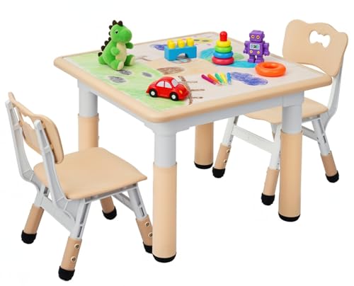 MAMIZO Barnbord med 2 stolar, barnstolsgrupp, justerbar höjd, bordsstolset för barnrum, plast, barnmöbler, målbord, sittgrupp för pojkar och flickor från 2 år (gult, fyrkantigt bord), KT-TC01