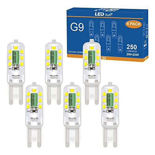Yuiip G9 LED-lampa 2 W, motsvarar 20 W halogenlampor, kall vit 6 000 K energibesparande lampa för 20 W, 25 W halogen, AC 220–240 V, inget flimmer, 360° strålvinkel, G9-stiftsbas, 5-pack