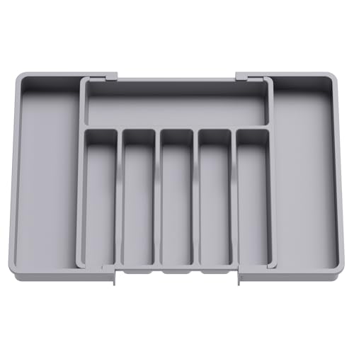 Lifewit organiserare för silverbestick, utdragbar besticklåda, lådinredning, justerbar lådinsats för bestick, kompakt plastlåda med plats för skedar, gafflar, knivar, stor, Grå