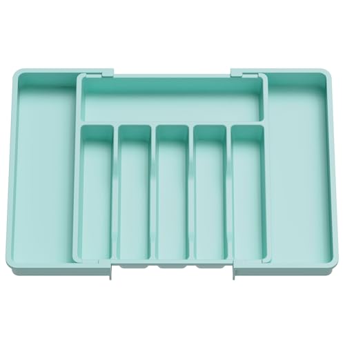 Lifewit organiserare för silverbestick, utdragbar besticklåda, lådinredning, justerbar lådinsats för bestick, kompakt plastlåda med plats för skedar, gafflar, knivar, stor,Turkos