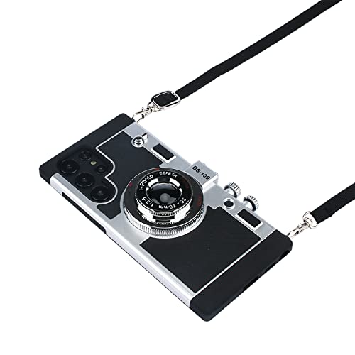 Awsaccy Camera Phone Case for Samsung Galaxy S22 Ultra 5G 6.8 Inch Camera Case Vintage Cover Cute 3D Cool Unique Design Silicone Case with Removable Neck Strap Lanyard for Girls Women Black