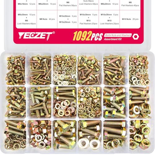 YEEZET 1092 st M4 M5 M6 M8 M10 bultar och muttrar kit, klass 8,8 kraftiga sexkantiga bultar sortimentsats, 21 vanligare storlekar, gul galvanisering