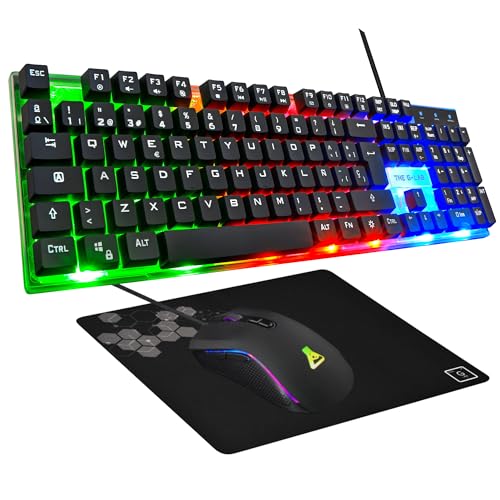 Gaming Tangentbord och Musuppsättning, QWERTZ Tysk Layout Rainbow LED-Bakgrundsbelysning Ergonomiskt Tangenter 2400 DPI Mus och Musmatta, USB-Kabel, Kompatibel med Windows, Mac, PS4, Svart