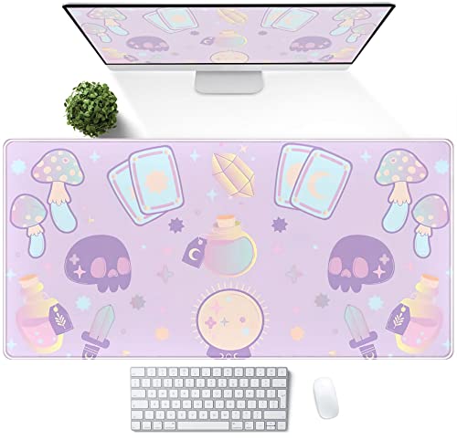 Skrivbordsmatta kawaii lila, detaljer med söt häxa, musmatta, mystisk goth, XXL gaming-matta, utökad, tangentbord och mus, stor, för dator och bärbar dator, flicka, gamer, skrivbordsdekor, 80 x 40 cm