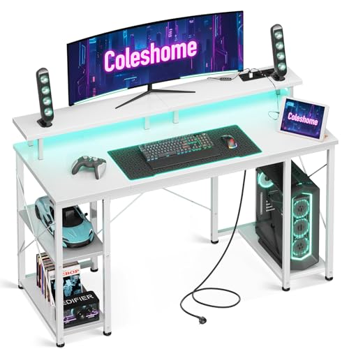 Coleshome Gamingbord med LED-belysning, 120x50cm Skrivbord med 2 Kontaktuttag och 2 USB-portar, Datorbord med Monitorställ för Hemmakontor (Vit)