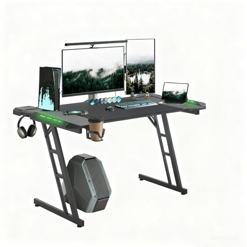 BEXEVUE Gaming Skrivbord med LED - 100 x 60 cm ergonomiskt spelarbord, Z-ram stabil kolfiber lätt att montera, stor stationär dator, hörlurskrokar