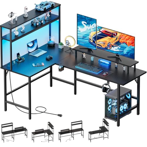 HLFURNIEU Hörnskrivbord med LED, 130 x 130 cm Ergonomiskt L-formad Skrivbord, Gamingbord med Monitorstativ, Spellbord med Kolfiberyta, Lätt att Montera, Svart
