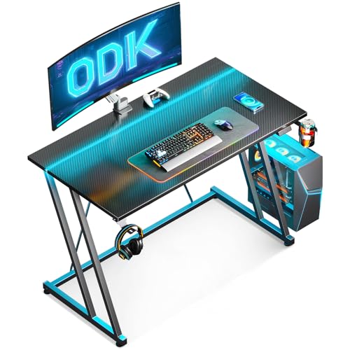 ODK 100 x 50 cm Gaming Bord med LED-Lampor och Eluttag, Litet Skrivbord med Mugghållare och Hörlurskrok, Datorskrivbord med Dubbel Z-Ram, Kolfiber Svart