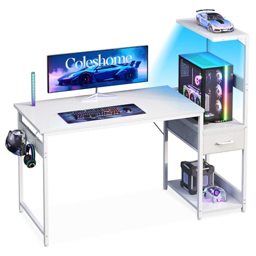 Coleshome Gamingbord med LED-belysning, Gamingbord med Lådor och Hylla, Reversibelt Gamingbord med Hörlurshängare (Vit kolfiber, 120x48cm)