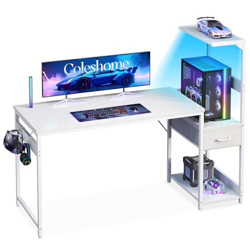 Coleshome Gamingbord med LED-belysning, Gamingbord med Lådor och Hylla, Reversibelt Gamingbord med Hörlurshängare (Vit kolfiber, 138x48cm)