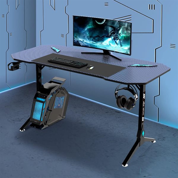 AufuN Gamingbord 140 x 60 cm, stabilt PC-skrivbord med kolfiberbeläggning, hörlurskrok och mugghållare, ergonomiskt datorbord arbetsbord, PC-bord spel (Tye B utan LED)