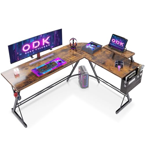 ODK Gamingbord, hörnskrivbord för spelare, skrivbord L-form med monitorstativ för kontor (Vintage Brun, 167 x 120 cm)
