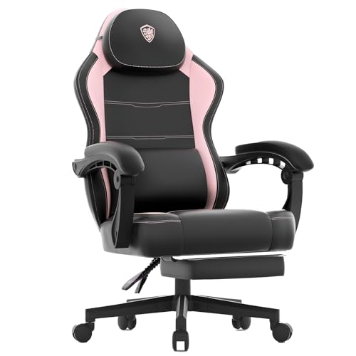Dowinx Gamingstol, ergonomisk, med ländryggsstöd, datorstol, kontorsstol, snurrstol, med justerbart ryggstöd och fotstöd, rosa