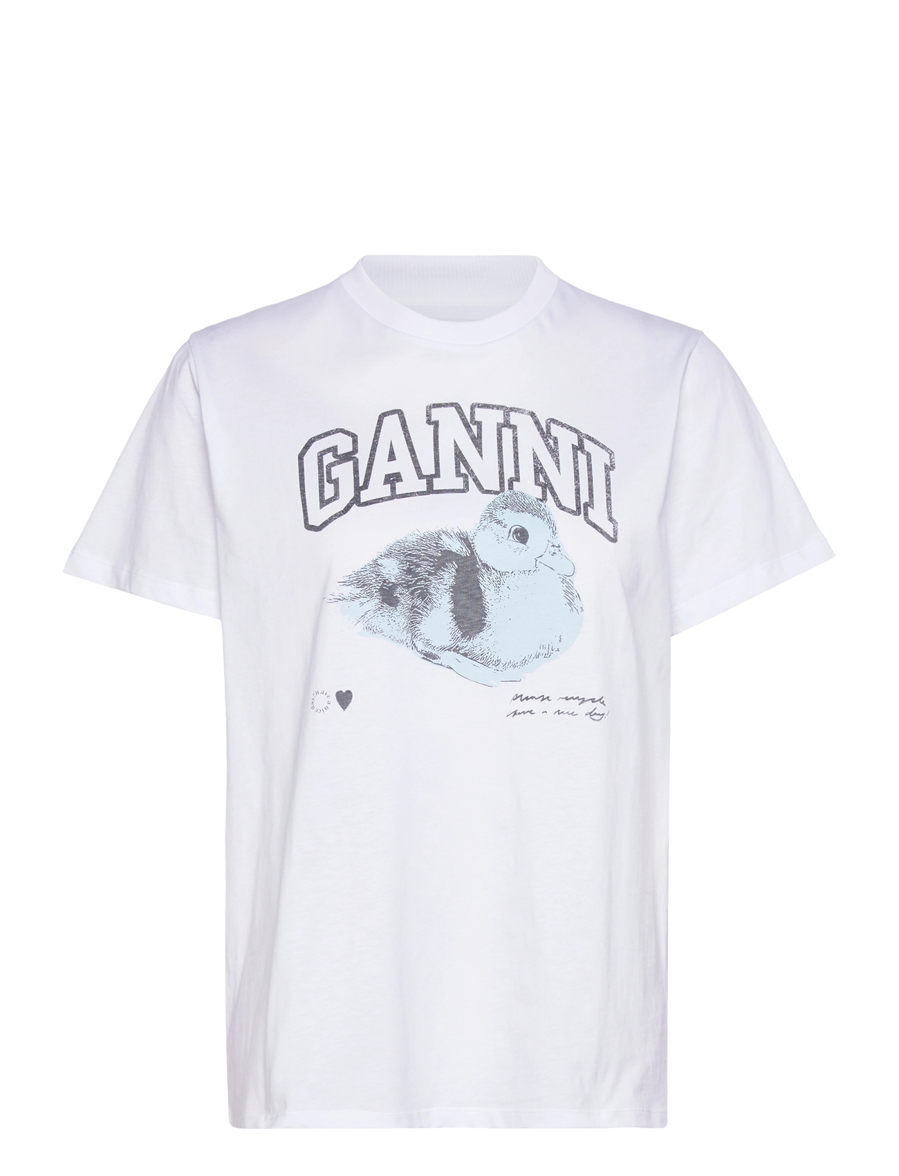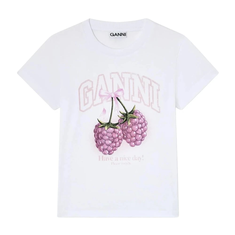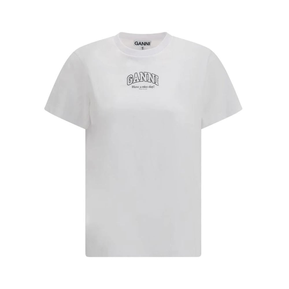 Ganni, Toppar , Dam, S, Bomull, Crewneck T-shirt med tryck fram