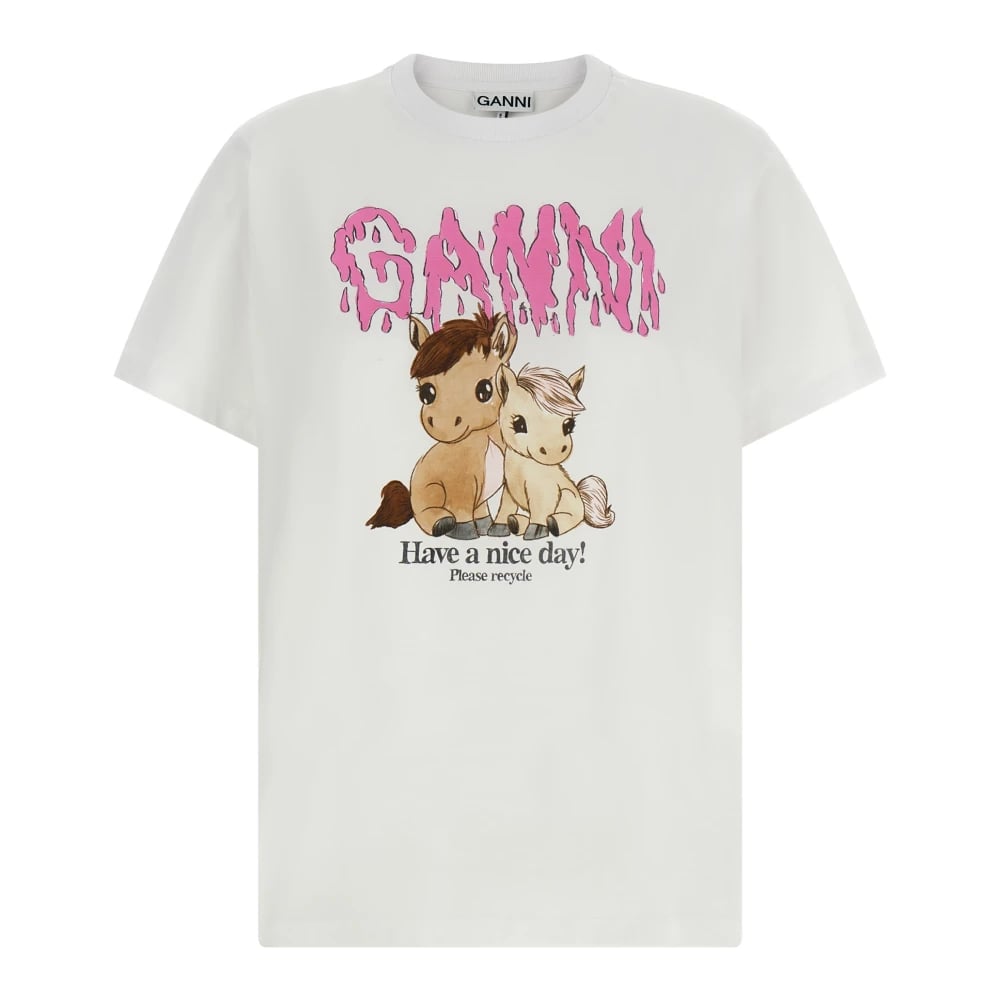 GANNI Cotton T-Shirt Embellished Graphic Print - White - XS
