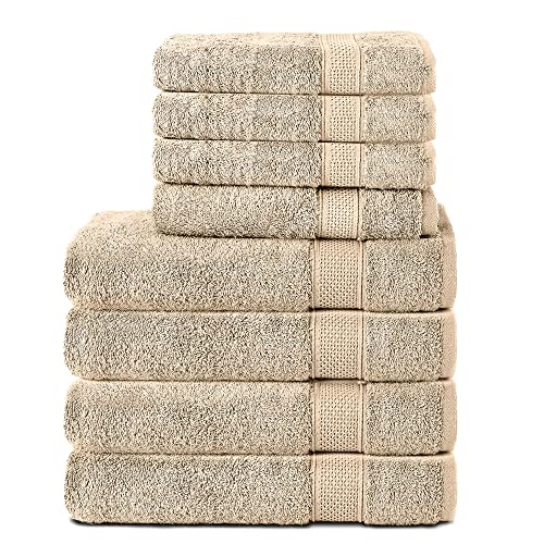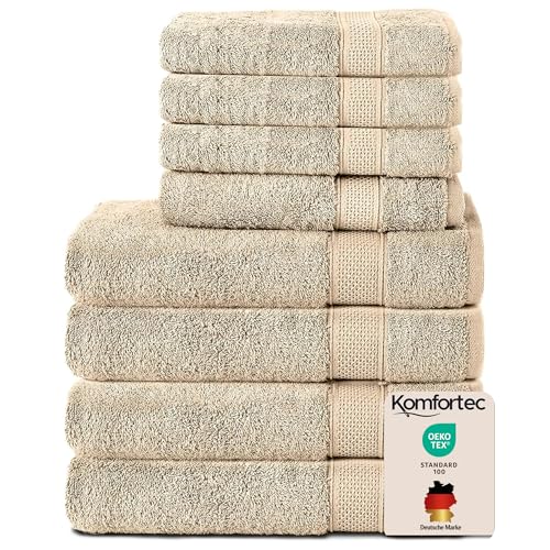 Komfortec 8-pack handduk set | 4 handdukar 50 x 100 cm och 4 badhanddukar 70 x 140 cm | frotté badhandduk & bastuhandduk XXL | 100% bomull – mjuk | snabbtorkande | sand/beige