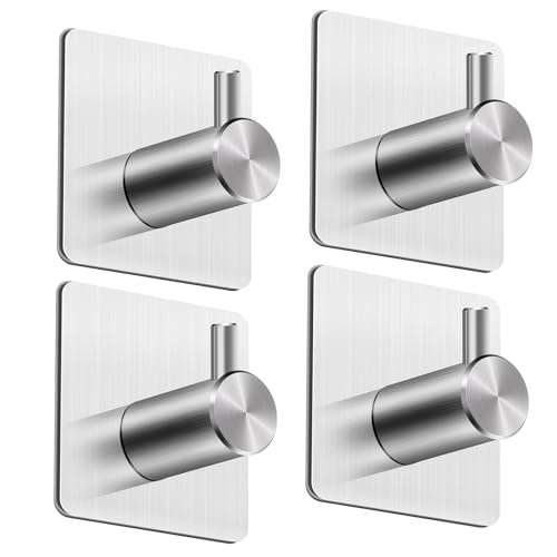 Självhäftande krokar, extra stark självhäftande, kraftigt rostfritt stål, ingen borr rostfri, klibbig på väggdörren för att hänga handduk kappa hatt väska nycklar i sovrum badrum kök, silver 4-pack