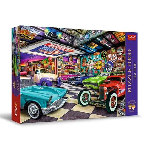 Trefl Premium Plus Quality - Puzzle Tea Time: Bilsamlarens garage - 1000 bitar, Serie med nostalgiska målade bilder, Perfekt passande bitar, för vuxna och barn från 12 år