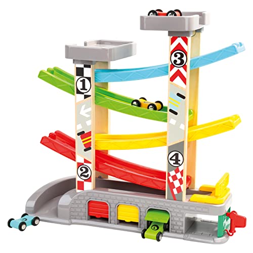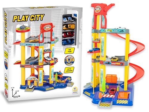 Teorema Giocattoli, Garage bil för barn, stor parkeringsplats 3 våningar bilar med hiss, spiralramp, biltvätt och 4 fordon ingår, barnbil från 3 år