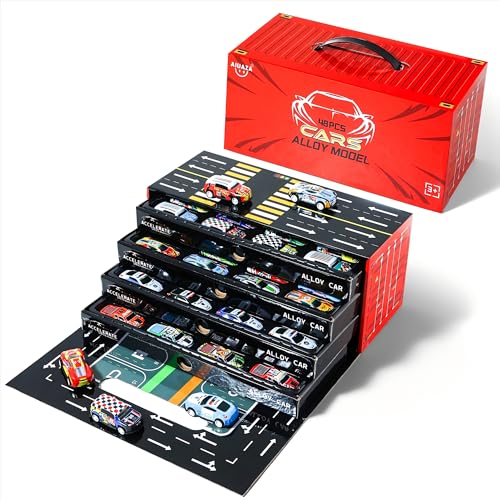 AIUAZA Mini gjutjärnsvagnsset för barn, bakåtdragna vagnar, gjutjärnsracerleksaker, med garage och spår, massproduktion av lekvagn för barn, lämplig för pojkar i åldern