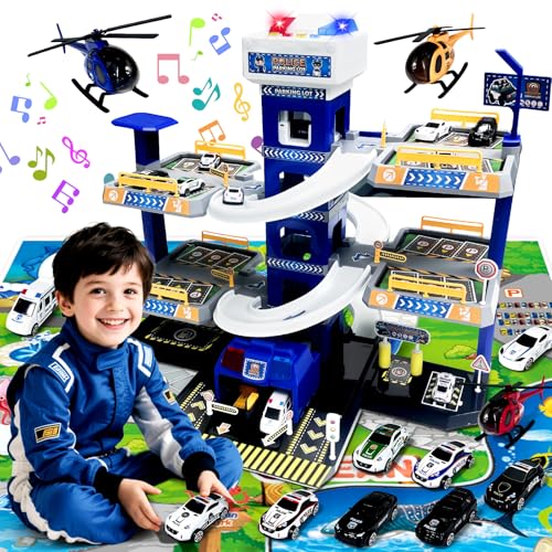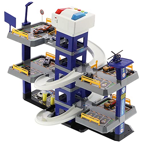 5 våningar parkering för barn, parkering med garage, räcken, hiss, bensinstation, ljus och ljud, barngarage med 12 bilar och 3 helikoptrar (blå)