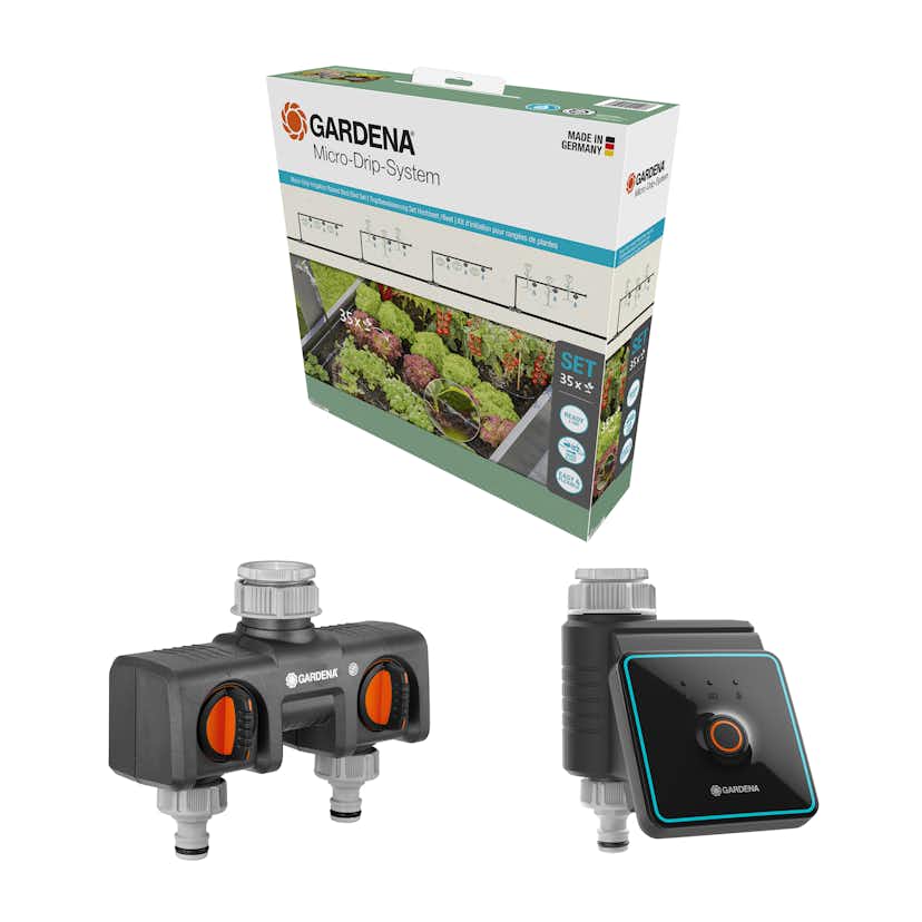 Micro-Drip Gardena Premiumpaket För Pallkrage med Vattenfördelare & Bevattningsdator