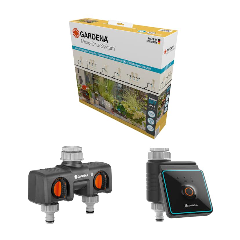 Micro-Drip Gardena Premiumpaket För Terrass med Vattenfördelare & Bevattningsdator