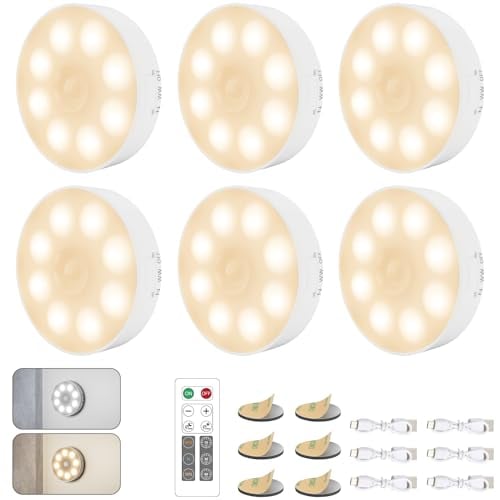 6 ST Skåpsbelysning [med Fjärrkontroll], 16 LED Trådlös Rörelsesensorlampa Puckljus, 3 Färgtemperaturer Dimbara 3000-6000K, Uppladdningsbar Skåpsbelysning för Skåp, Garderob, Kök, Hall, Trappor