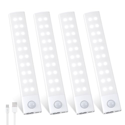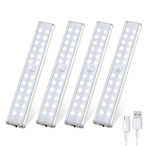 40 LED-garderob, 20 cm reglette LED köksrörelsesektor, uppladdningsbar USB-C trådlös 3 färger dimbar LED-nattlampa för garderob kök trappor hall (4 pack)