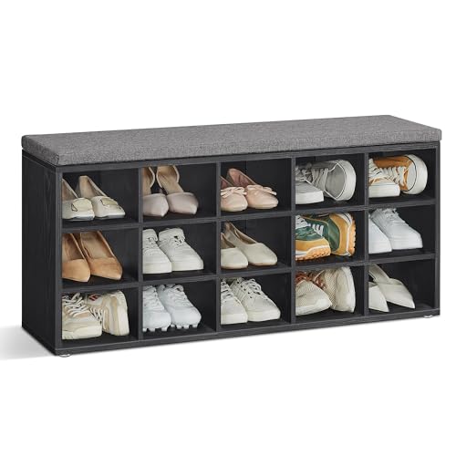VASAGLE Skobänk, skoorganiserare med 15 fack, vadderat säte, för entré, hall, garderob, svart trä och grå skiffer LHS015B02