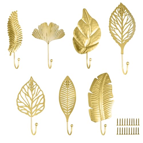 MAIJIAJU 7 stycken garderobskrokar i guld, blad klädkrokar väggkrokar för borrning med 10 skruvar, metall vintage, väggkrokar garderob, barn, moderna klädkrokar för dörr, sovrum, garderob