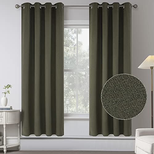 Olivgrön absolut mörkläggning falskt linne texturerad gardin draperier för sovrum – energibesparande värmeisolerade anti-rost öljett fönstergardiner för vardagsrum (2 paneler, B 132 x L 160 cm längd)