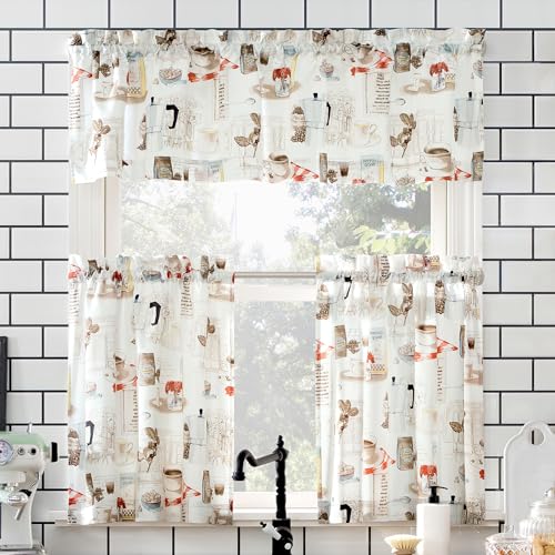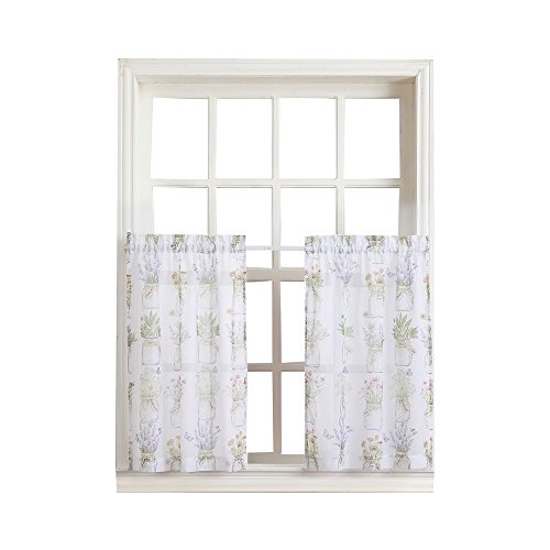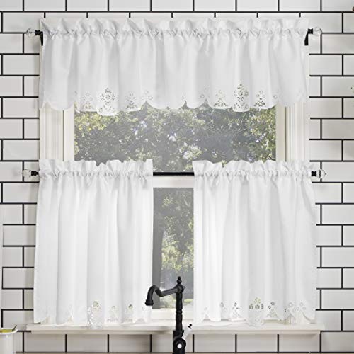 Nej. 918 Mariela blommig trim halvgenomskinlig stång ficka kök gardin kappa och nivåer set, 147 x 91 cm, vit