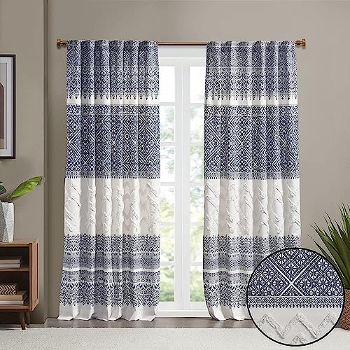 INK+IVY Mila 100% bomull enkel panel gardin tuftad chenile boho design stång ficka topp draperi för vardagsrum, privat fönsterbehandling för sovrum, lägenheter, 127 cm x 213 cm, marinblå/vit