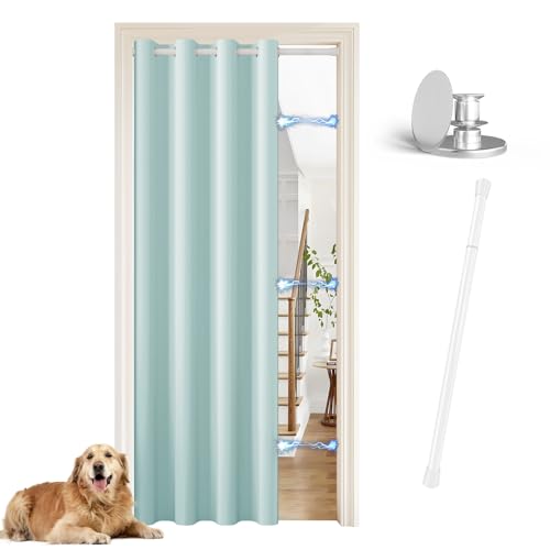 JCyh Magnetisk dörrgardin med fjäderspänningsstång, aquablå ytterdörrsgardin 132 x 195cm, 1 panel gardin + svart stång