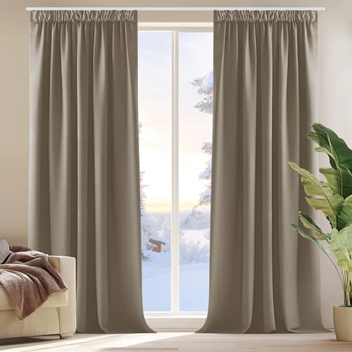 Deconovo ogenomskinliga mörkläggningsgardiner termiska gardiner med tejp, 220x140cm (höjd x bredd), taupe, uppsättning med 2