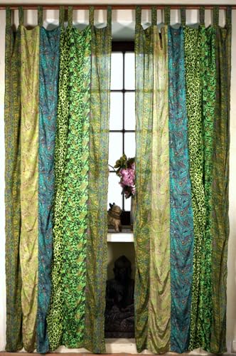 GURU SHOP Boho Patchwork Gardiner, 1 par bohemiska gardiner av sarityg, unikat – gröna, syntetiska, 230 x 100 cm, dekorativa gardiner