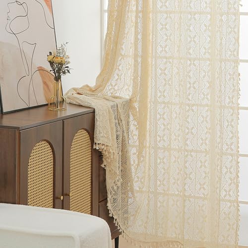 RUIXUAN 150 x 230 cm boho gardiner shabby chic stickade gardiner ogenomskinligt broderi tofs set om 2 beige gardin vintage gardiner för vardagsrum sovrum gardiner