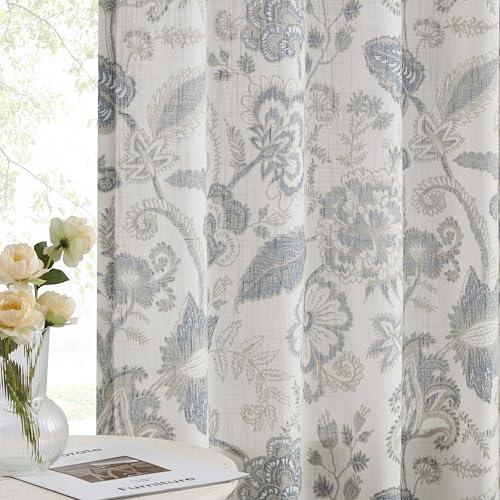 Kayne Studio Bakflik Stång Ficka Jacobean Blommig Halvgenomskinliga Gardiner Boho Botaniskt Blad Tryckt Vintage Bondgård Blå Grå Ljusfiltrering Fönster Behandling Set Vardagsrum Sovrum, 132 cm x 213