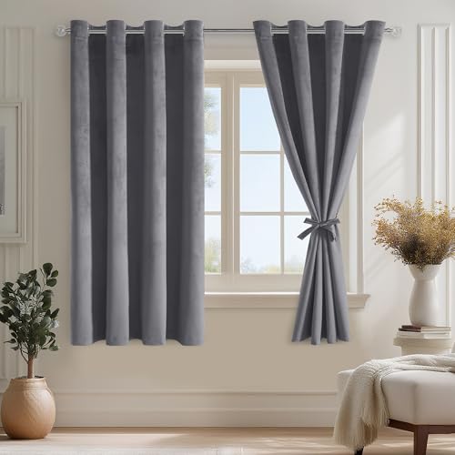 DWCN Grå termisk gardin i sammet gardiner öljetter set om 2 stycken H 225 x 132 cm med gardinslipsar, mjuka köldskydd gardiner ogenomskinlig sammetsgardin för gardiner vardagsrum sovrum tjock termisk